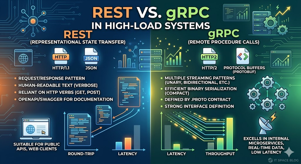 Scaling a high-load system in 2026? Compare REST and gRPC performance, latency, and use cases. Learn why IT Space recommends gRPC for efficient internal microservices.